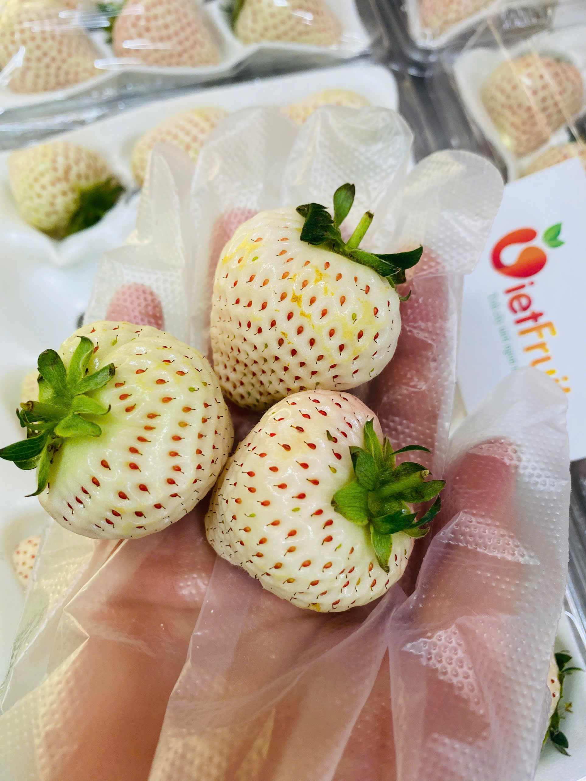 Dâu Bạch Tuyết (hay còn gọi là dâu trắng) là giống dâu đặc biệt có nguồn gốc từ Nhật Bản. Khác với dâu đỏ truyền thống, loại dâu này sở hữu màu trắng ngà hoặc trắng kem, điểm xuyết những hạt đỏ li ti nổi bật bên ngoài – một vẻ đẹp vừa lạ mắt, vừa cuốn hút.