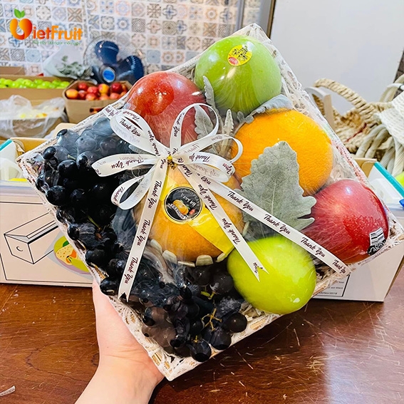 hộp quà trung thu kết hợp tinh tế giữa hoa quả và bánh trung thu mang phong cách độc đáo mới lạ.